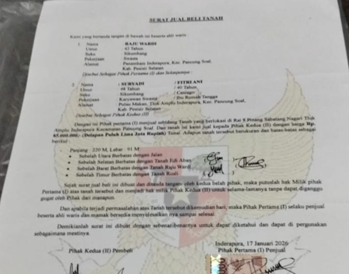Ironisnya tanah tersebut di jual oleh Raju Wardi (43) warga Pancung Soal kepada pasangan suami istri Suryadi (46) dan Fitriani (40) yang di tanda tangan oleh pemerintah nagari Tluk Ampalu Indrapura pada tanggal 17/1/2026.